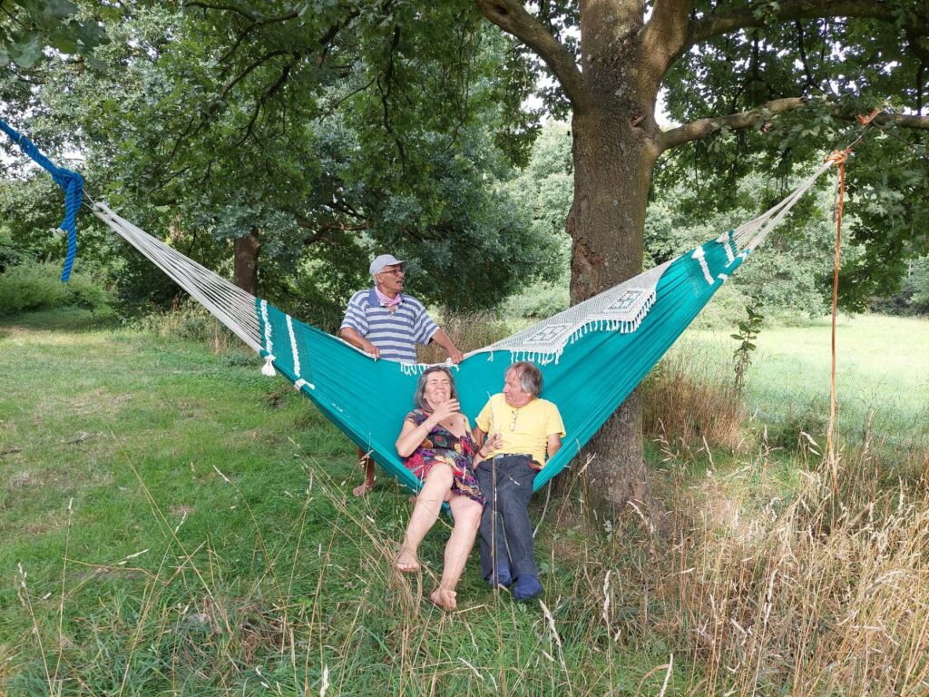 Gemütliches Beisammensein mit Speisen, Getränken, angeregten Gesprächen und Hängematten-Experimenten.